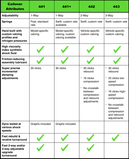 FEAL offers 441, 442 & 443 specification shocks and more. The difference lies in adjustability: 1,2,3 way, external reservoirs. Feal also offers upside-down option for BMW E Chassis, divorced setup, full coil, you name it.